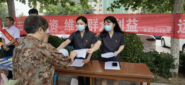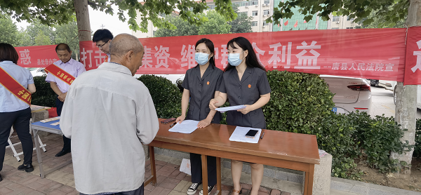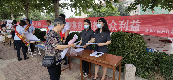 为进一步加大防范非法集资宣传力度,有效遏制非法集资活动,切实维护群众利益,按照县政府办统一安排,6月15日上午,唐县人民法院刑事审判庭干警在县政府广场开展以“学法用法护小家 防非处非靠大家”为主题的防范非法集资宣传活动。